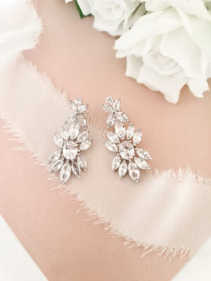 Kolczyki ślubne wiszące pięknie podkreślają urodę i fryzurę panny młodej. Dostępne są w różnych wersjach: krótkich, długich, z cyrkoniami lub zdobione kwiatami czy perłami.