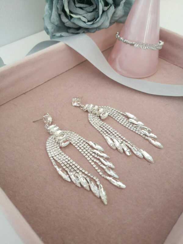 Kolczyki, które oczarowują – to właśnie wzór Fable. Długie, wiszące i pięknie połyskujące przy każdym ruchu. To kwintesencja stylu nowoczesnego glamour. Inspiracją były najnowsze trendy ze światowych wybiegów, i modzie ślubnej nie powinny być one obce. Wyrafinowane i eleganckie kolczyki pięknie skomponują się przeróżnymi stylami sukien ślubnych. Biżuteria wykonana jest z najlepszej jakości stopów jubilerskich, a użyte do zdobienia cyrkonie posiadają najwyższą klasę (AAA+), dzięki czemu cechuje je twardość porównywalna do diamentu oraz wysoki połysk.