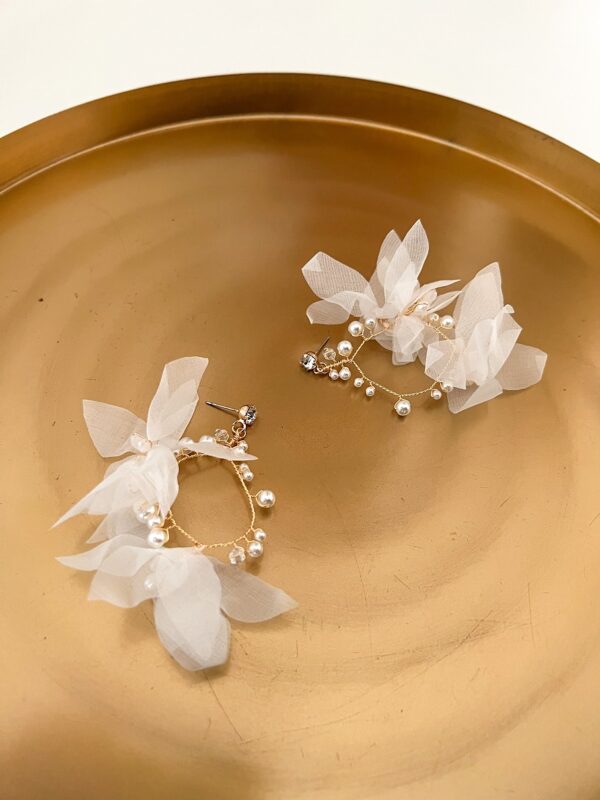 Delikatne lecz spektakularne kolczyki z listkami z tiulu, perłami, kryształkami i cyrkonią to idealna propozycja dla nowoczesnej i romantycznej panny młodej lub druhny. Wpasowują się w styl boho glam, romatyczny, fairytale lecz również urban chic.